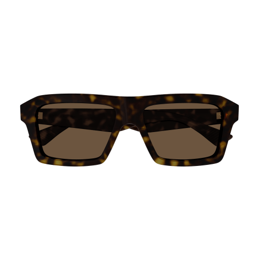 Full acetate masculine rectangular with flat bar style characterized by sharp and bold volumes. Geometrical temple shape enriched by the iconic metal fringed ribbon. Bottega Veneta logo on the top of the temple.