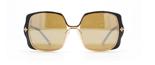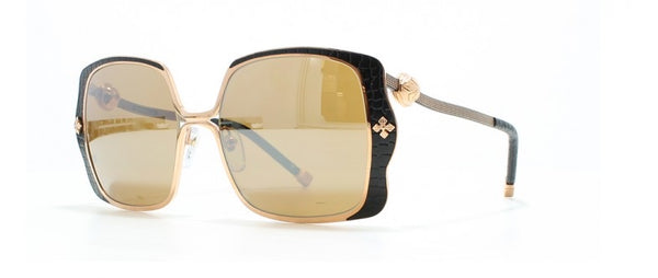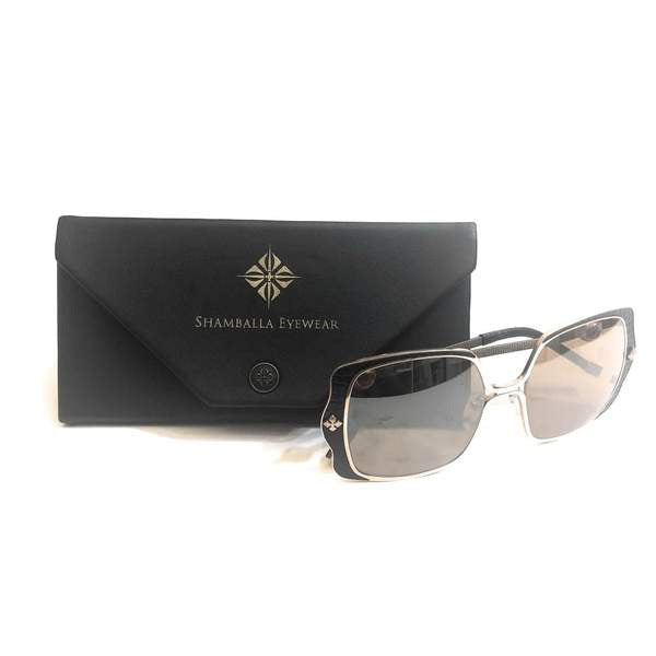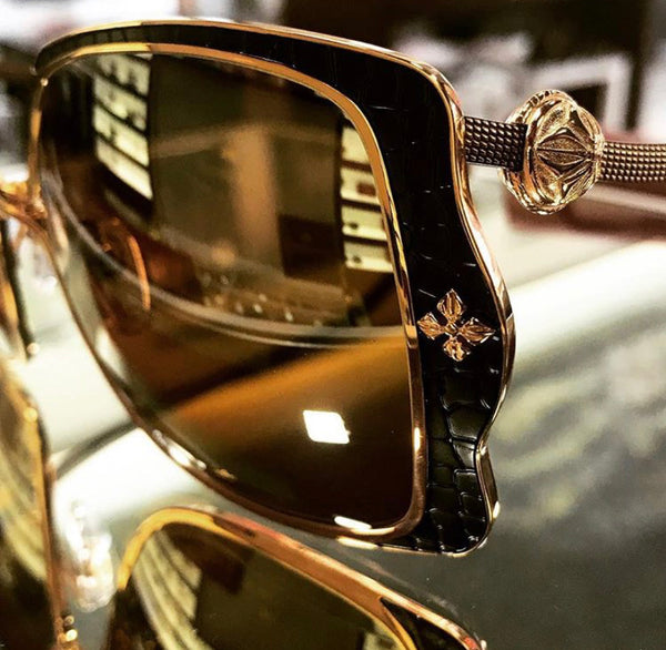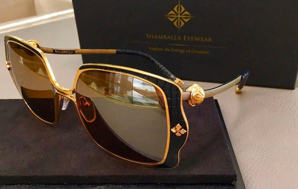 If you are looking for a less traditional jewelry frame, eyeglasses designer Shamballa Eyewear offers an exceptional collection. Rather than just simple gold, it uses titanium, rose gold, silver, rhodium, and Italian leather. You will also encounter details of inlaid sapphires and black diamonds. These frames are incredibly unique. The sun lenses are Zeiss and provide 100% UV protection. The leather trim is exotic Italian leather.