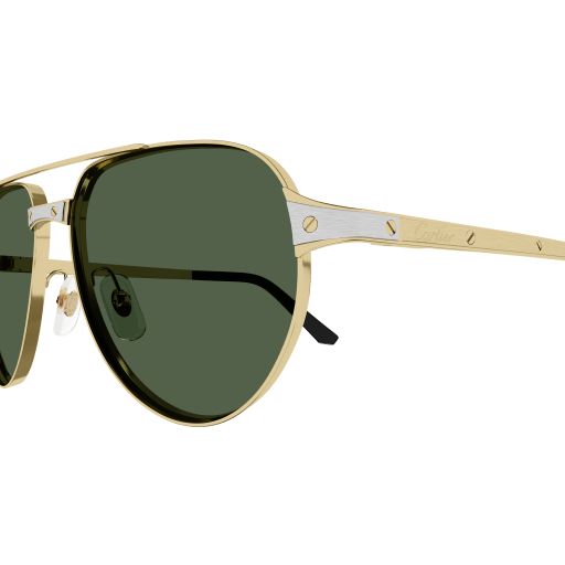 Masculine double bridge pilot shape to complete the Santos Evolution family with a bold bi-layer construction. Metal front enriched with an aesthetic flat metal component to enhance the Iconic Santos Screws and reproduce the watch’s shape. Recognizable Santos temples also enriched by the Santos screws décor and the Cartier logo engraved. The acetate temple tips present the iconic Screw Dècor. Precious finish in gold and platinum thanks to the bi-galvanic treatment.